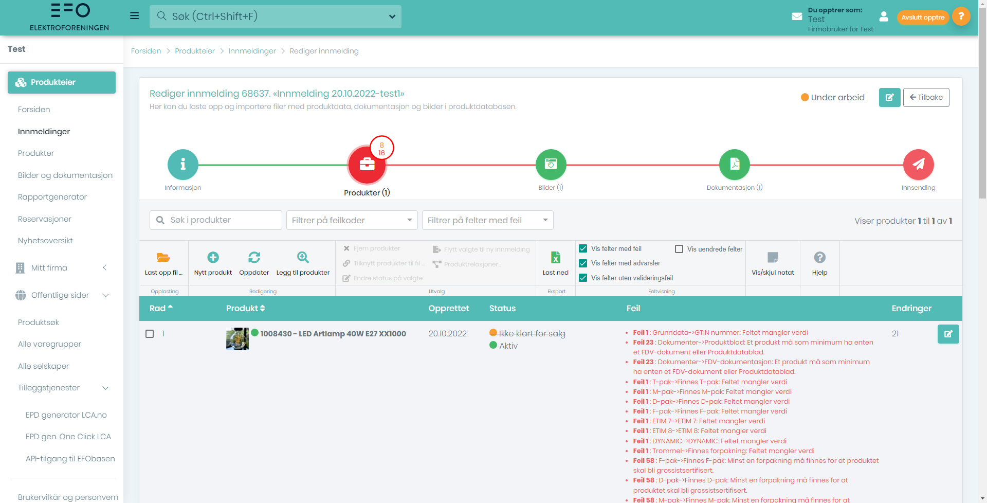 | Legg til | Legg til produkter – her får du rask tilgang til produktsiden i EFObasen, hvor du kan se og administrere bedriftens produkter. Du kan merke av produkter for innmelding, endre eksisterende registreringer eller legge til nye produkter. For å registrere et nytt produkt, klikk her. Merk at du må ha et gyldig elnummer, som du finner under "Reservasjoner" i menyen til venstre. Se også hjelpesiden for skjermbildet "Opprett produkt" for mer veiledning. |