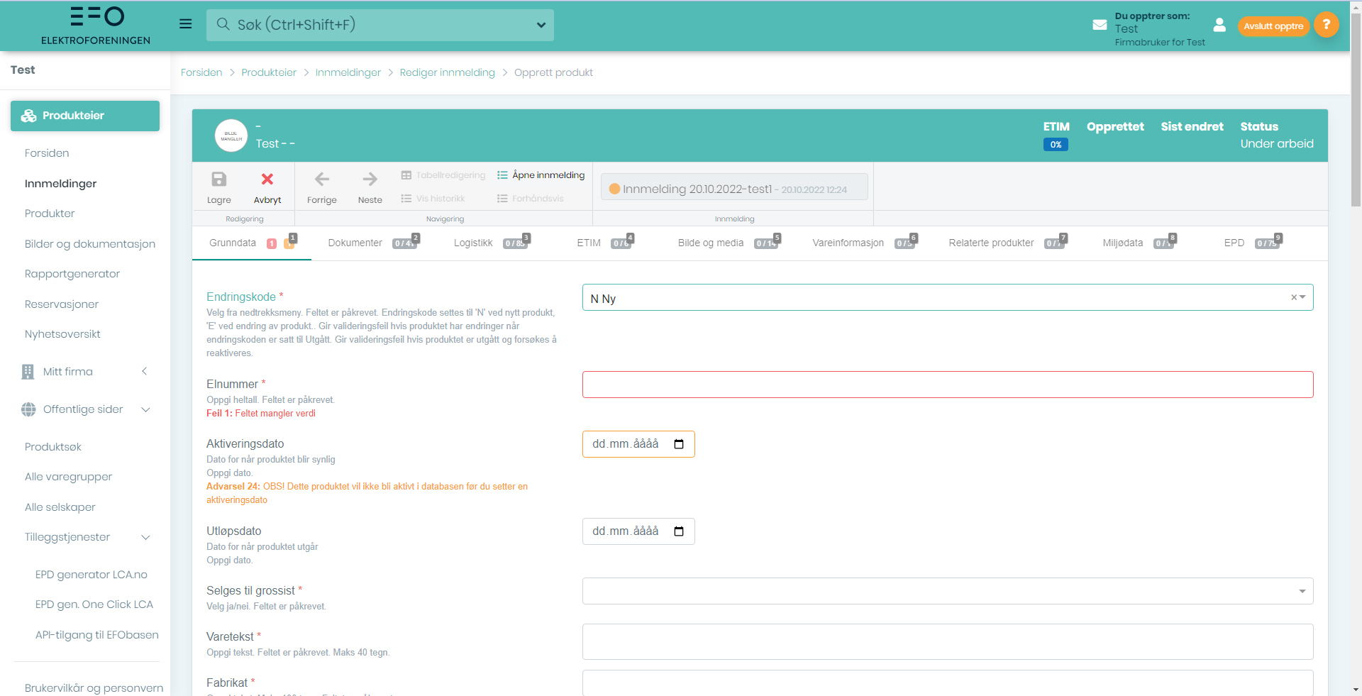 På denne siden kan du opprette et nytt produkt og redigere alle datafelter knyttet til et produkt. Siden har flere faner. Merk at du må ha et gyldig elnummer for å kunne registrere et nytt produkt. I det første feltet under fanen Grunndata velger du endringskode for produktet. N for nytt produkt, E for endring av produkt og U for utgått produkt.