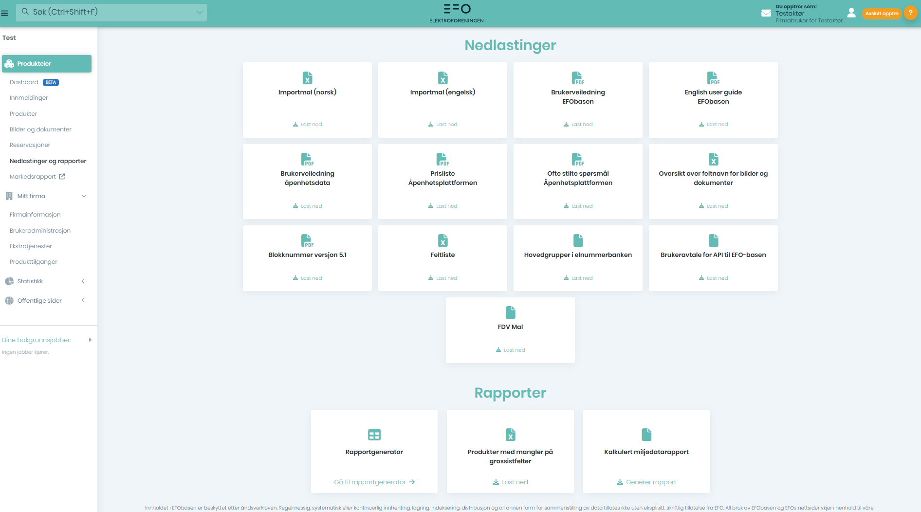 | Feltliste | Oversikt over alle felter, oppslagslister, produktstatuser og produktrelasjonstyper i EFObasen, med mulighet til å ekskludere ETIM og miljødata ved nedlastning |