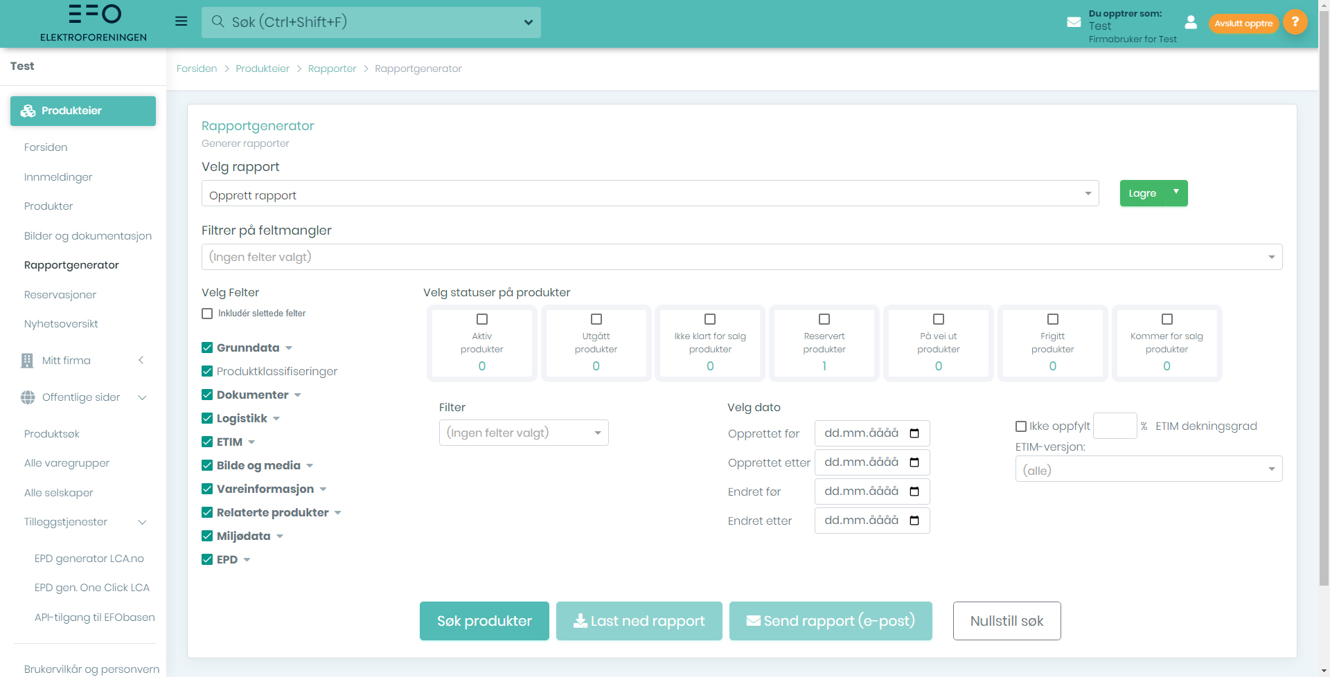 | Last ned Excel | Her kan du laste ned Excel-rapport for de utvalgte feltene. |